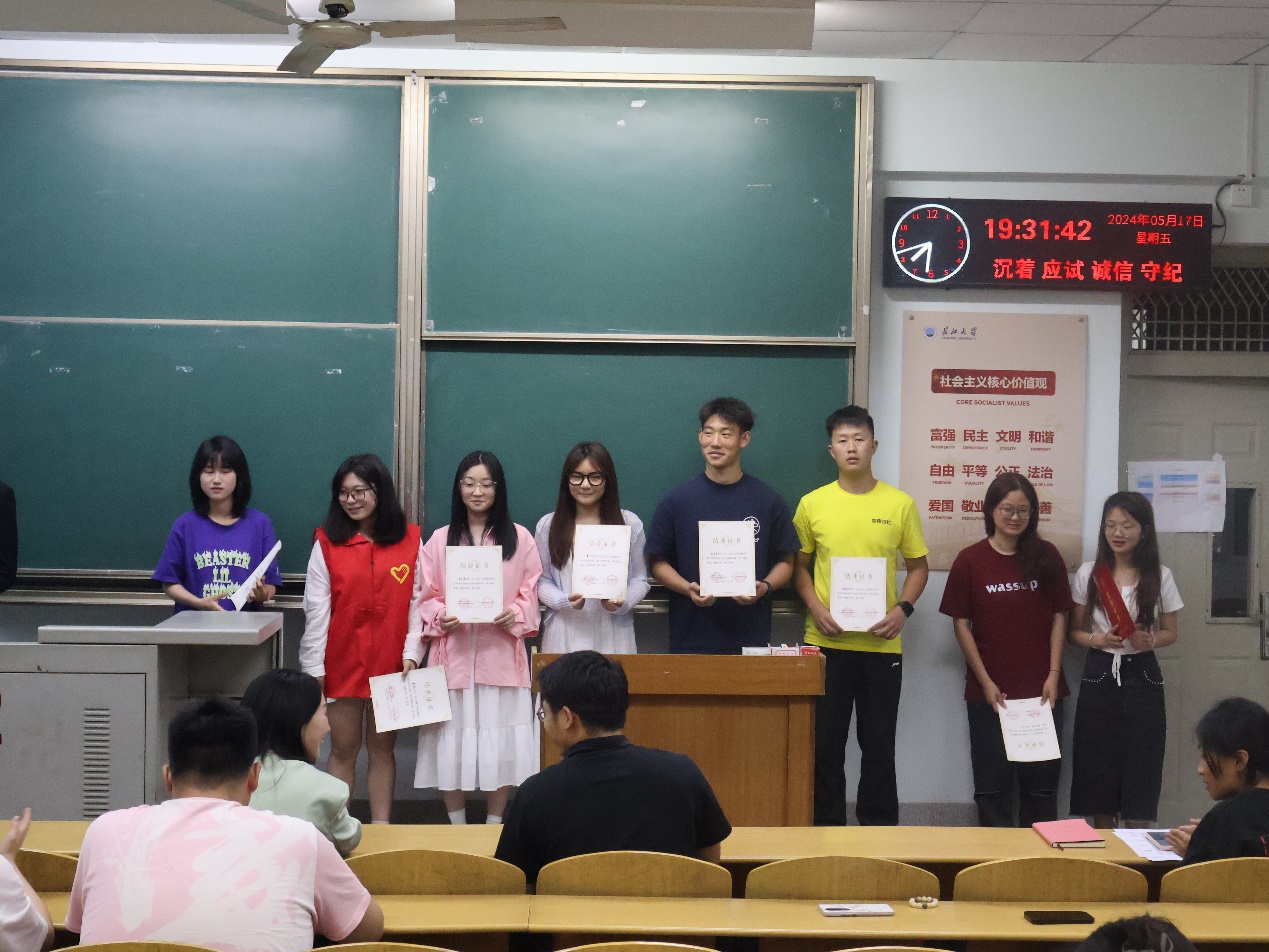 结课仪式上,主持人宣布了结业人员与优秀学员,任雯婷老师和喻泽坤老师为他们颁发证书,并鼓励学员们始终保持积极向上的态度,为学院发展贡献青春力量。紧接着,优秀学员代表表示将继续坚定信念、不忘初心,坚持服务好长大青年,踔厉奋发、砥砺前行。