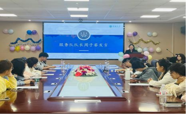 接着,学院党委副书记何可可发表致辞。他关心现在队内情况,并结合上届力博服务队表现剖析了现届力博服务队面临的机遇与挑战。他表示,因为上届力博成员在支教等志愿活动方面表现出色,所以现届应以他们为榜样,更加主动地谋划机遇,杜绝“等、靠、要”的思想,做到主动上,主动讲,勇于担当,积极作为。