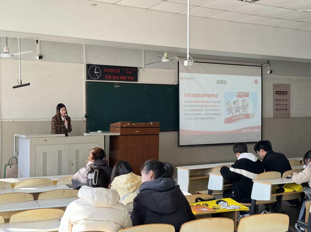 【通讯员 袁宝宏 杨雅月】考编择途,公途耀未来。为帮助学生明晰考公考编形势,提升备考能力与就业竞争力,bat365官方网站于 11月28日14时许在12教104举办了考公考编备考和就业指导讲座,特邀资深专家占欢老师担任主讲嘉宾,此次讲座吸引了众多有志于投身公职领域的学生参与。