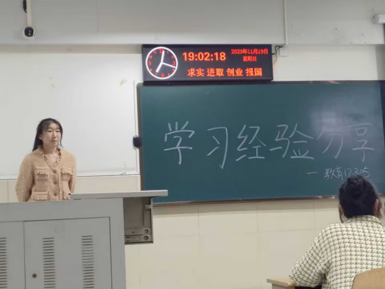 学习交流分享会的最后,我班同学还与王娜学姐进行了互动,学姐就同学们学习上的一些具体困惑进行了一一解答。此次活动,不仅让我班同学学习到了大学学习方法,更加解开了同学们对大学生活以及学习方面的一些困惑与迷茫,使同学们对未来的大学生活拨云见日,信心倍增。