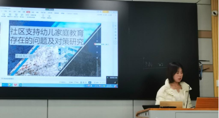 赵田同学就“社区支持幼儿家庭教育存在的问题及对策研究”进行了专题报告。她就研究背景、研究目的和意义、理论基础、研究内容和研究不足五个方面对社区支持幼儿家庭教育存在的问题和相关对策进行了详细的阐述,并就此发表了自己的看法和观点。