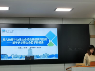 杜馨同学就“幼儿教育中幼儿生命特性的疏离与回归——基于狄尔泰生命哲学的视角“进行了专题汇报,她从一个很新的视角论述了幼儿生命特性,主要选题缘由、研究目的、研究内容、研究中存在的问题以及引发的相关思考进行了详细阐述。