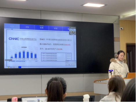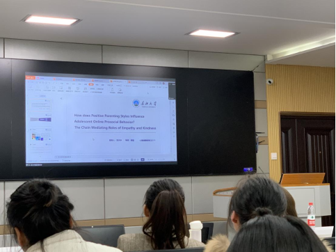 王品逸同学就“学校疏离和国内中学生网络霸凌的关系:涉及自尊和情绪智力的有调节的中介模型”做了专题报告。她主要从引言、方法到结果、讨论和体会介绍了自尊的中介作用,情绪智力调节作用,并且用一些案例来进行分析,最后与现场同学展开了讨论。