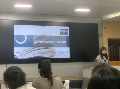 马芝娟同学就“寓教于购:基于价值观认同的广告说服性”的研究设计做了专题报告。她主要是从双关的含义入手,分析了不同价值导向的双关语广告对于说服性的不同影响,介绍了被试为在校大学生、正向价值导向的双关语广告为自变量、消费目的为调节变量、产品信任度为因变量的实验设计。