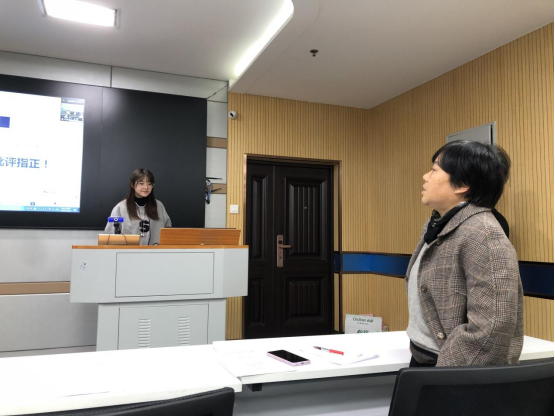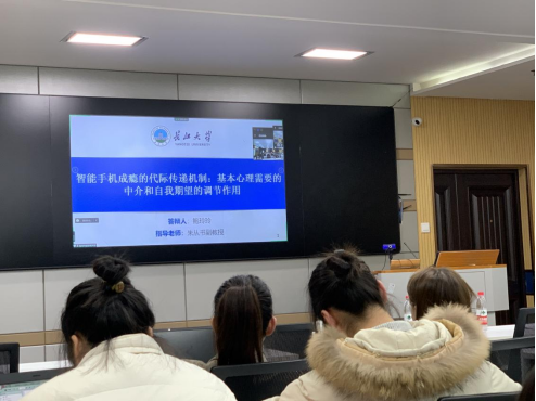 鲍玲玲同学就智能手机成瘾的代际传递机制:基本心理需要的中介和自我期望的调节作用做了专题报告。她从选题背景、文献综述、研究方法、结果、讨论、不足和展望,表达了自己的观点和看法,并对其进行理性的分析和思考。