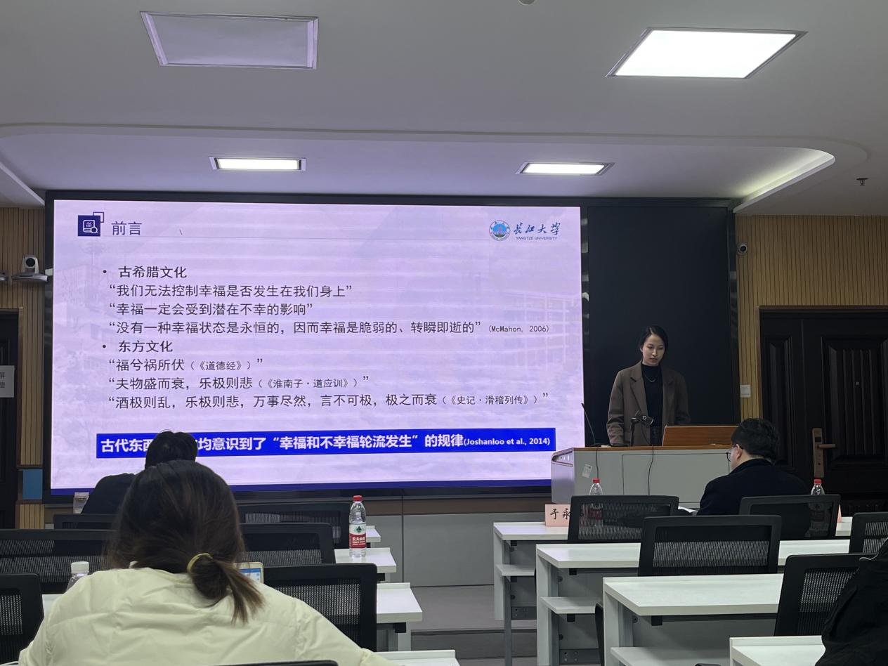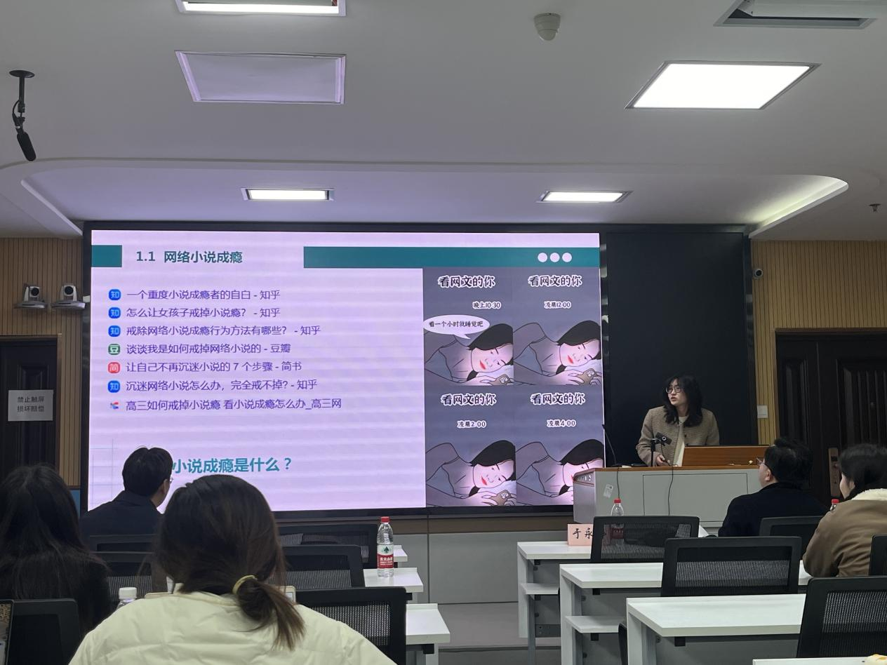 本次活动的四位主讲,即2022级教育学专业心理学方向的秦珂楠、程丽媛、曹晓萱、杨博依次就其研究作了汇报。