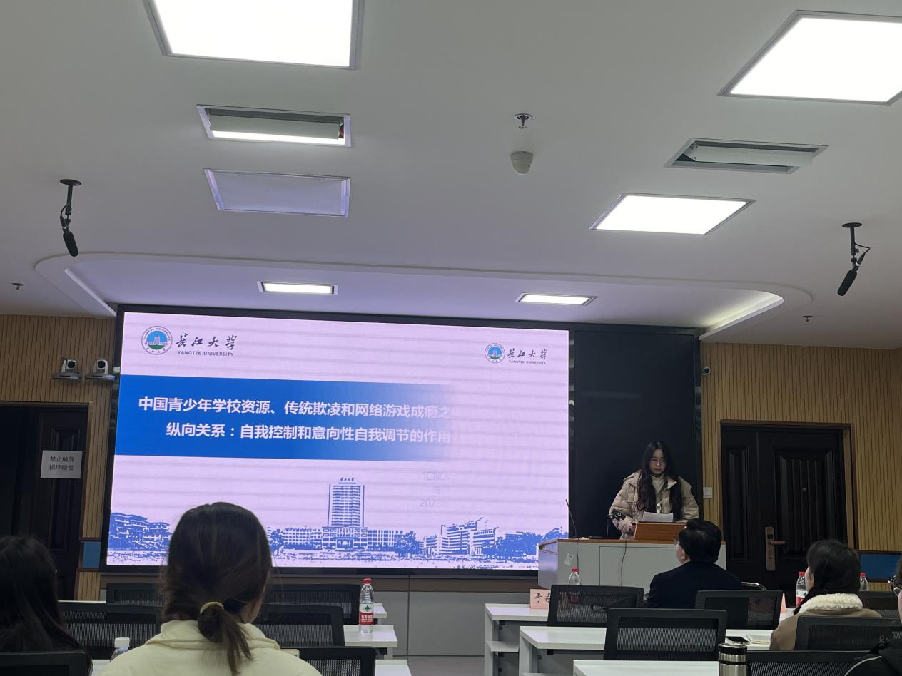 秦珂楠汇报的主题为《中国青少年学校资源、传统欺凌和网络游戏成瘾之间的纵向关系:自我控制和意向性自我调节的作用》,她指出自我控制在学校资源和传统欺凌的关系以及学校资源和网络游戏成瘾的关系中起中介作用,意向性自我调节在模型中的调节作用,模型拟合程度良好,研究结果说服力强。