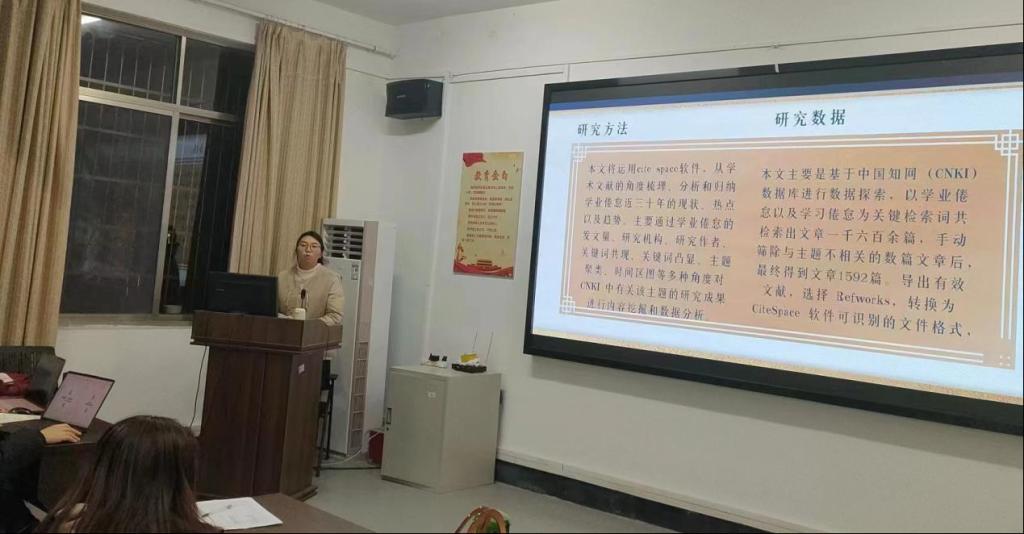 姚贝贝同学汇报主题为《国内学业倦怠研究三十年:现状、热点与趋势的知识图谱——基于cite space可视化分析》,她从研究方法、研究现状、研究热点、研究趋势、研究结果五个方面开展,研究主要探讨了我国对学习倦怠的研究现状,研究运用cite space软件、从学术文献的角度梳理、分析利归纳学业倦怠近三十年的现状,热点以及趋势,主要通过学业倦息的发文量、研究机构、研究作者关键词共现、关键词凸显、主题聚类、时间区图等多种角度对CNKI中有关该主题的研究成果进行内容挖掘和数据分析。
