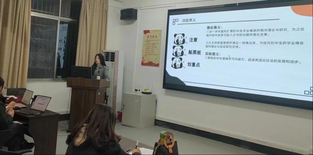 针对谭静同学的研究汇报,郑老师首先肯定了无效家庭环境在目前的学校教育当中的价值;其次,在学习倦怠方面建议增加学生产生学习倦怠的原因,如压力、升学等;接着,在针对中介变量时建议增加关于无聊倾向和生命意义感的文献,来增强文章的说服力;最后在团辅干预方面建议换成父母支持进行团辅干预。