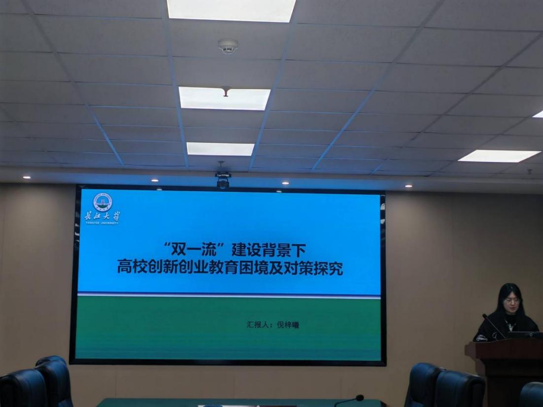倪梓曦汇报的主题是《“双一流”建设背景下高校创新创业教育困境及对策探究》,她指出“双一流”建设和创新创业教育在价值体内核和育人目标上具有一致性,都是响应时代和国家对拔尖创新型人才的的要求。她还清晰地介绍了从创新创业教育的现实困境迈向创新创业教育的优化路径的应对策略。