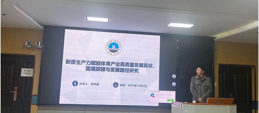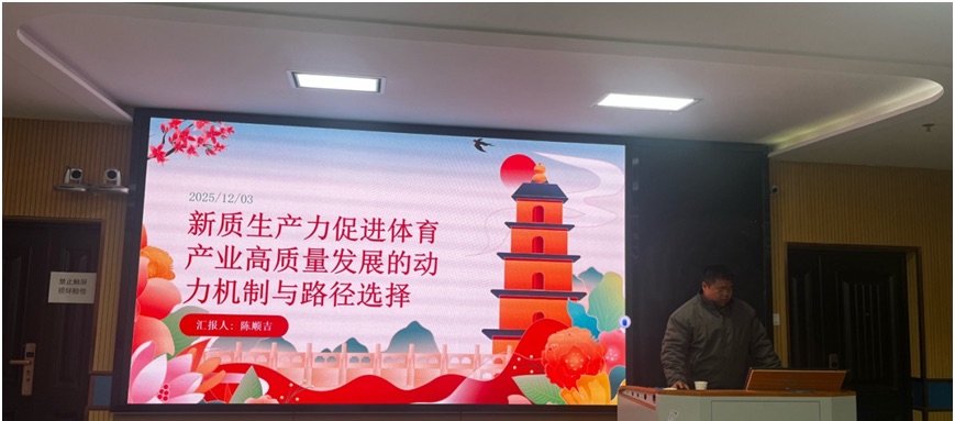 陈顺吉同学汇报的主题为《新质生产力促进体育产业高质量发展的动力机制与路径选择》,该研究系统探讨了以技术创新为核心的新质生产力如何为体育产业转型升级注入核心动力。研究不仅界定了核心概念,更深入剖析了新质生产力推动产业发展的内在机制,直面当前面临的关键问题,并提出了具有操作性的优化路径。该研究为在数字经济与智能科技背景下,体育产业如何突破瓶颈、实现内涵式增长提供了重要的理论参考和实践指引。