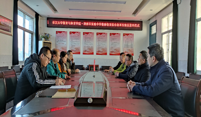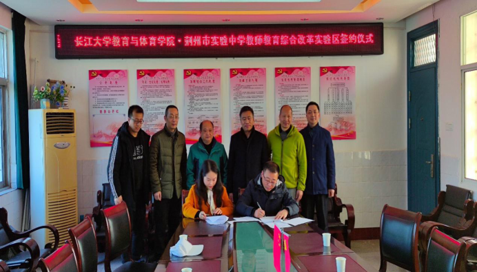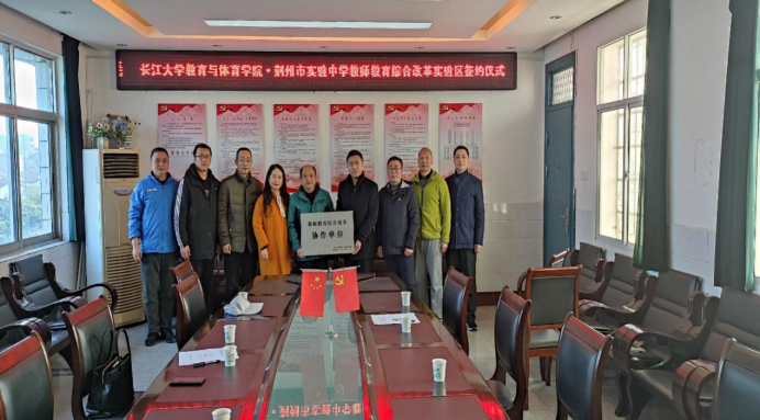 2021年3月12日上午,为了更好推动“教师教育综合改革实验区”建设,bat365官方网站教师教育学院(bat365官方网站)与荆州市实验中学正式签署“教师教育合作协议”,开启了双方在职前职后教师联合培养培训方面的全面合作。bat365官网教师教育学院党委书记高明成、副院长张艳红、体育教育系主任杨青宝、社会体育指导与管理系主任孔祥魁及体育课程与教学论教师王剑副教授、荆州市实验中学校长倪磊、副校长汤组军、科研处主任王用华、体音美教研员谭海林及体育组组长张文举等参加了签约仪式。