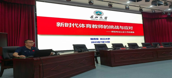 2023年7月12日,bat365官网体育教育系主任杨青宝副教授应荆州区教育科学研究院的邀请,参加荆州区2023年暑期中小学体育与健康教师专业能力提升培训。在荆州市实验小学(荆北校区)大礼堂,杨老师为荆州区体育教师开展了题为《新时代体育教师的挑战与应对》的专题讲座。讲座由荆州区教科院体育教研员梅江老师主持。