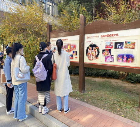 下午两点,迈入书声朗朗、朝气蓬勃校园,邓老师介绍了迎面而来的展示栏,这是该校的特色社团活动:有古筝、琵琶、笛子等各种类型,将中国传统文化与学生兴趣结合,感受文化精华促进个性发展,现代气息与传统文化交融。