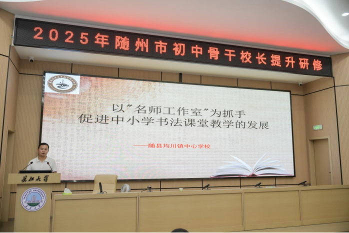 随县均川镇中心学校张俊校长汇报的主题是:《以"名师工作室"为抓手 促进学校书法课堂教学的发展》,重点阐述了学校以名师工作室为依托开展书法课特色课程的经验。