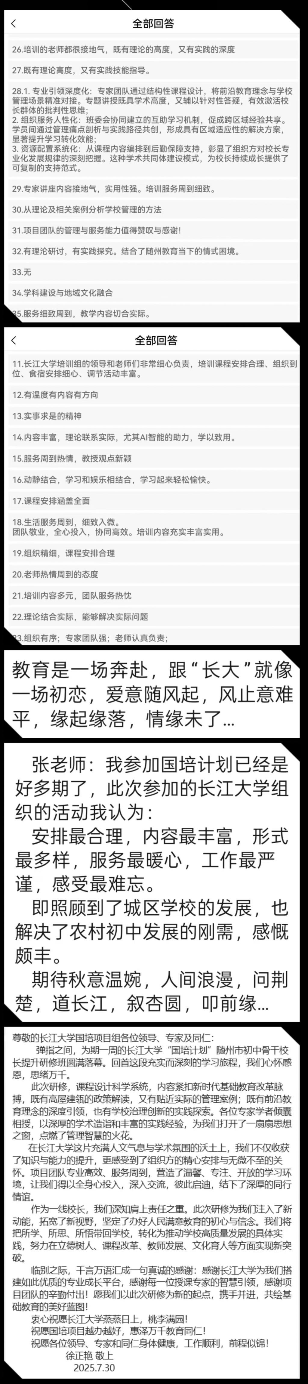 7月30日的集中培训结业仪式上,班委精心制作了研修回顾视频《一场关于“爱”的奔赴》。学员代表董校长动情地说:“这次培训是思想的洗礼,更是前行的动力。”