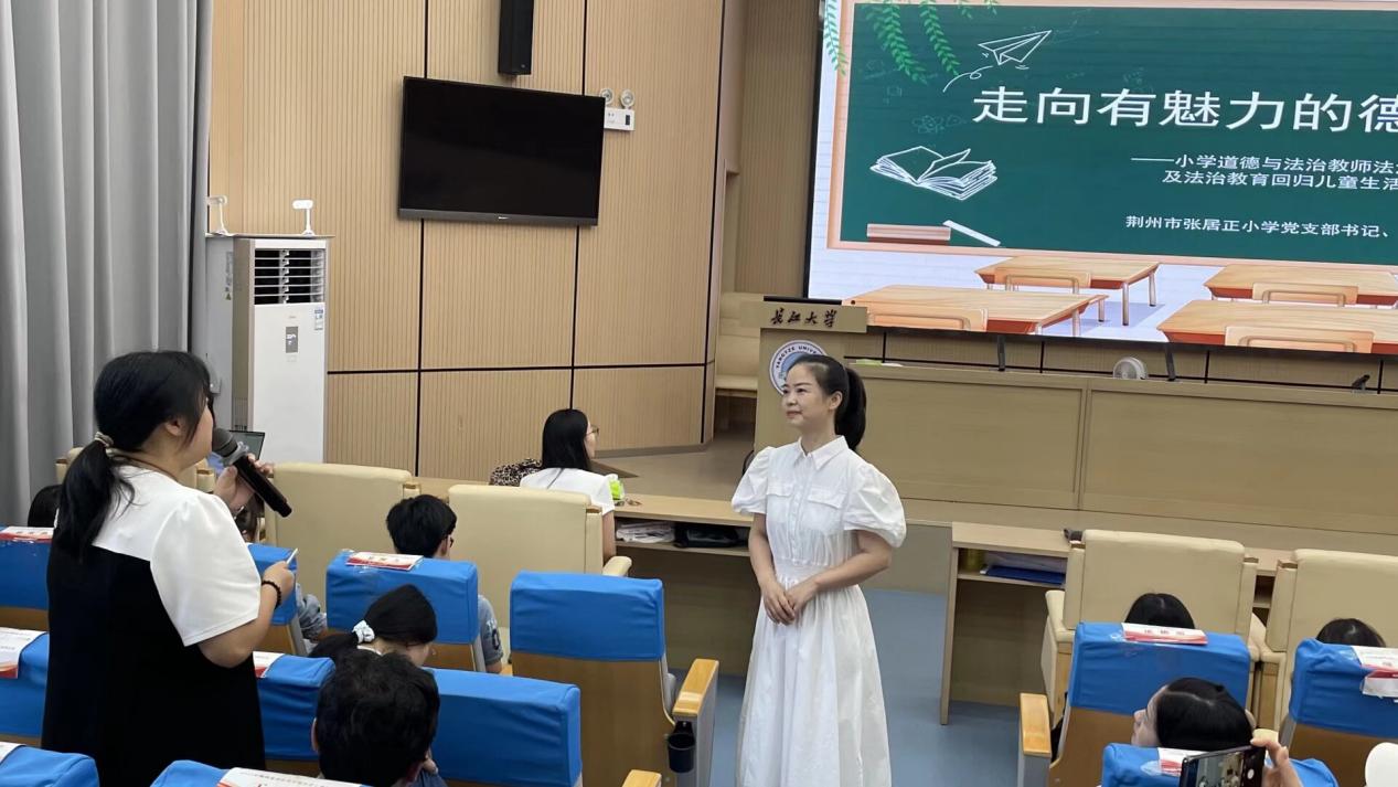 沙北实验小学汤娟校长的讲座《走向有魅力的德育课堂——小学道法教师法治素养培育及法治教育回归儿童生活的研究》重点探讨了教师法治素养的提升以及如何将法治教育自然融入儿童生活,增强法治课堂教学的吸引力和实效性。
