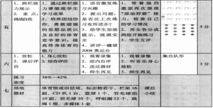 (4)检验学习成果,各组之间进行看谁的动作优美、技术动作合理、栏间节奏好的比赛,培养学生体育兴趣和团结协作、勇敢顽强的思想品质以及良好的体育竞争意识,提高终身体育的能力。